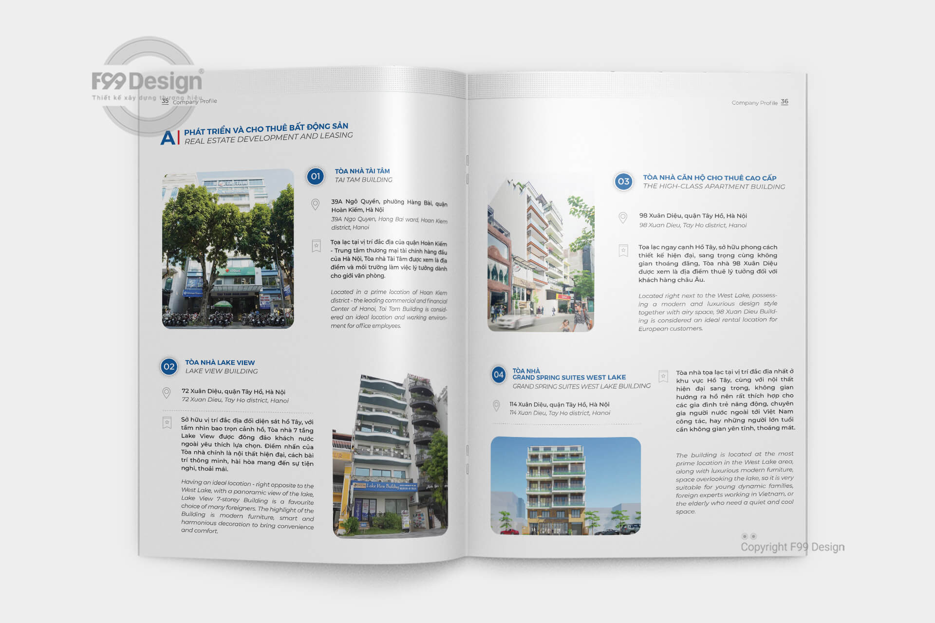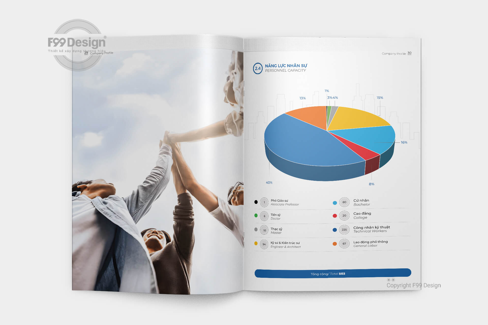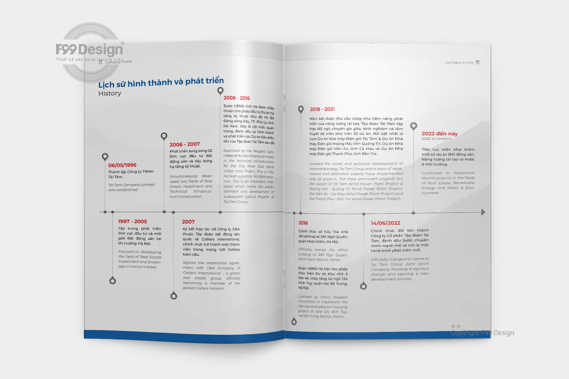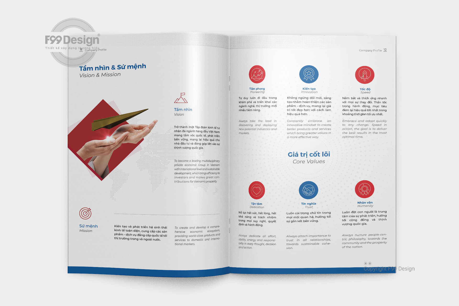 Với đội ngũ tư vấn thiết kế chuyên nghiệp nhiều năm kinh nghiệm về đấu thầu, dự thầu cho công ty, doanh nghiệp các công ty mới thành lập (công ty cổ phần, công ty TNHH…) dễ dàng gây ấn tượng thông qua cuốn Hồ sơ năng lực (Company Profile) một cách hiệu quả. Với kinh nghiệm hơn 6 năm hoạt động về xây dựng cuốn hồ sơ năng lực, khách hàng hoàn toàn yên tâm về chất lượng, giá rẻ, cũng như dịch vụ tại F99 Design. F99 Design cam kết mang tới khách hàng cuốn hồ sơ đầy đủ hồ sơ pháp lý, dịch vụ, mời thầu để gia tăng giá trị dự thầu cho nhà thầu một cách hiệu quả.