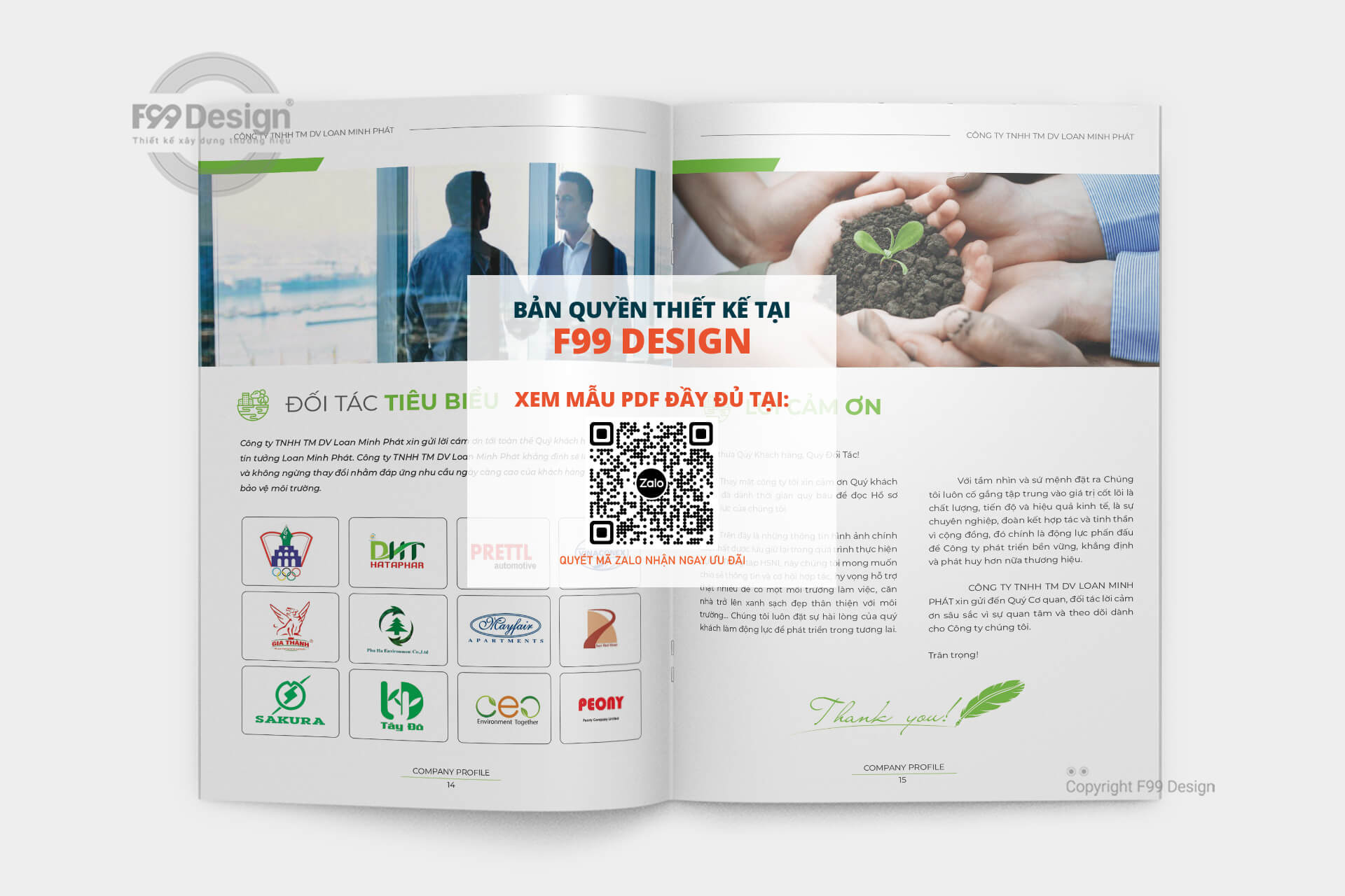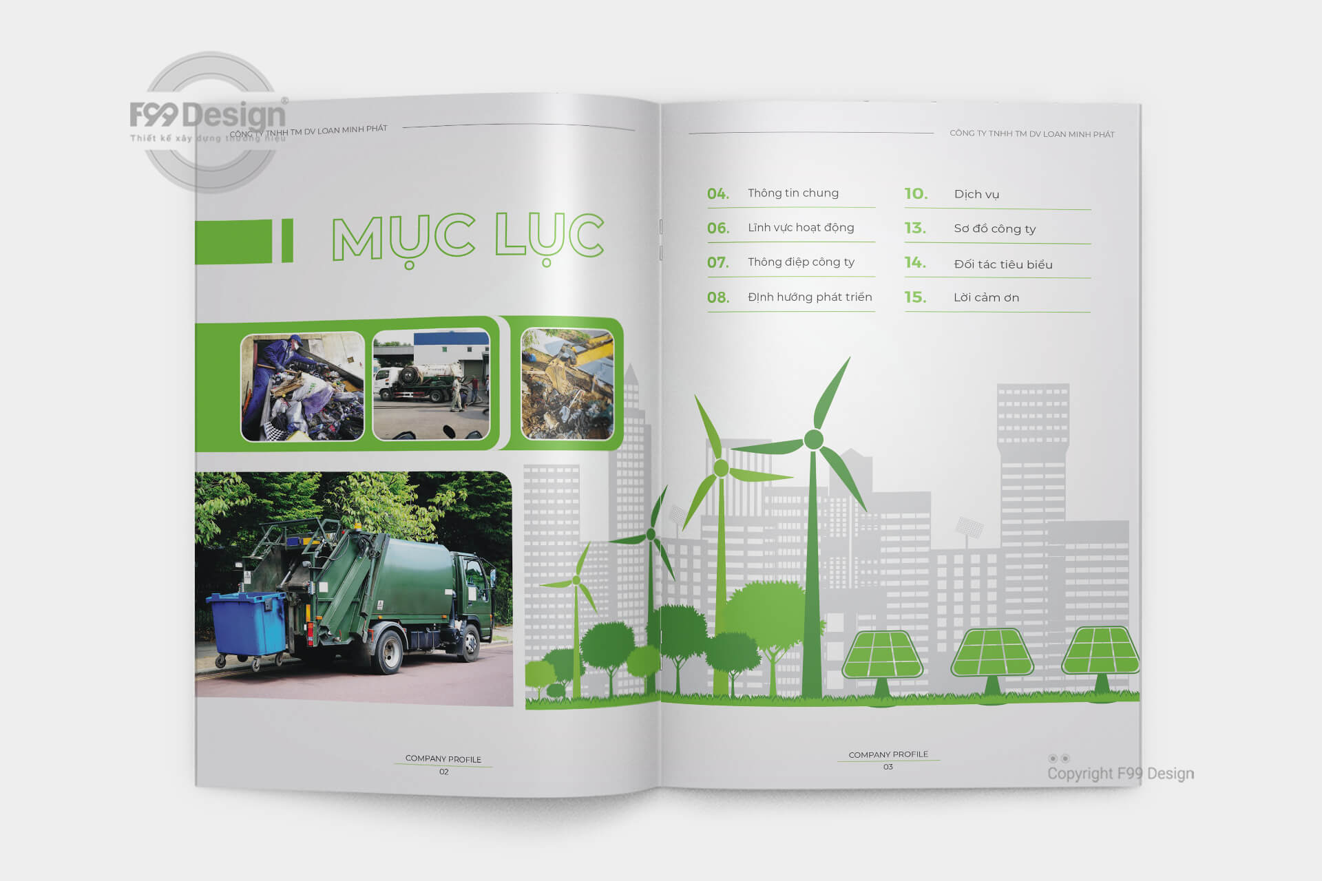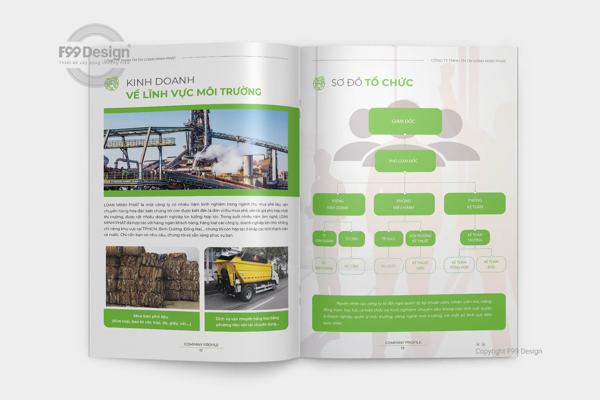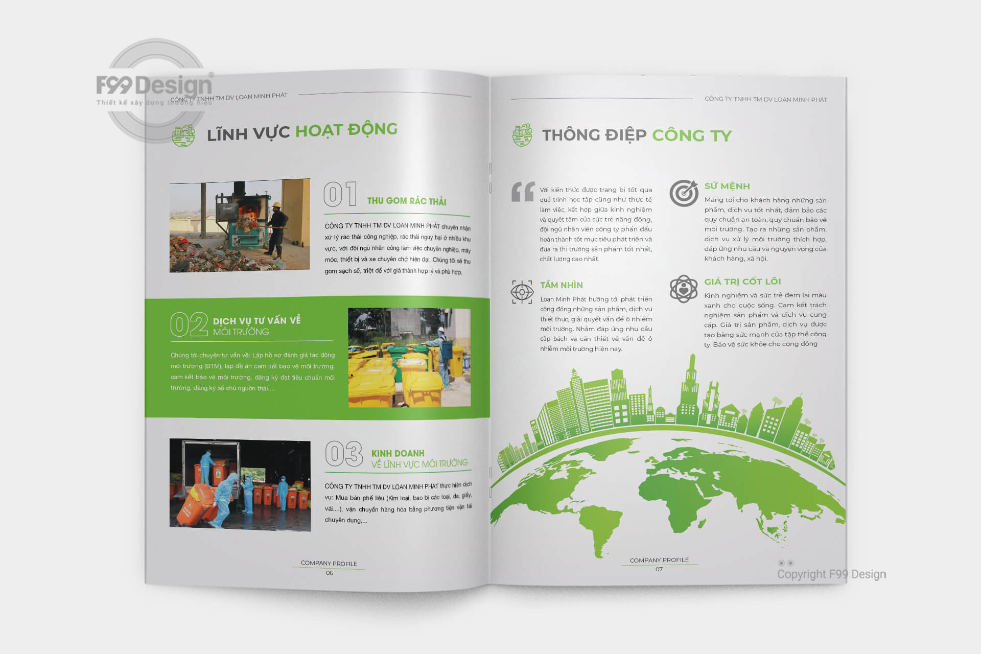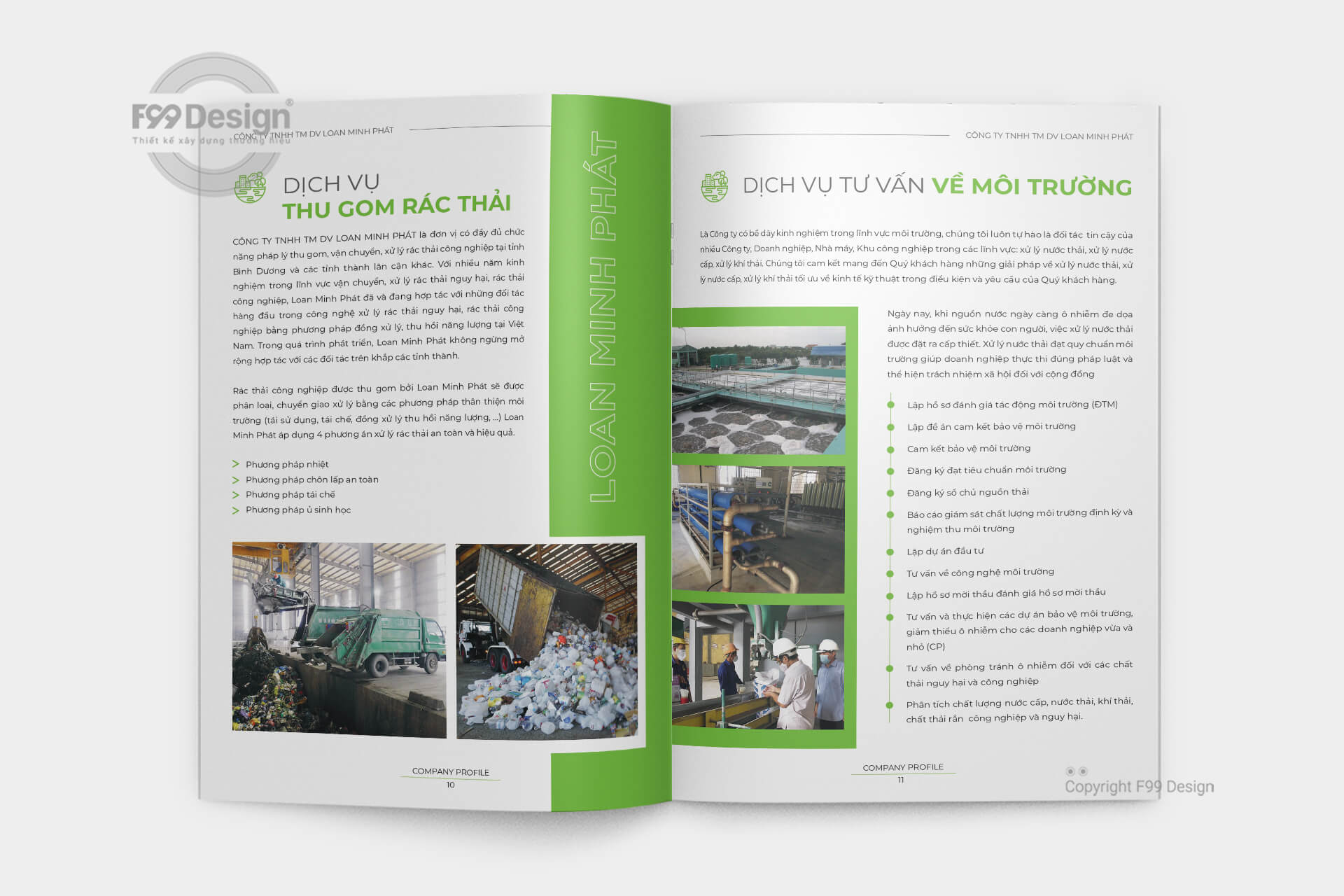 - Thiết kế profile Công ty TNHH TM DV Loan Minh Phát: Là một trong những đơn vị hoạt động uy tín trong lĩnh vực thu gom rác thải và môi trường, Loan Minh Phát sở hữu đội ngũ nhân lực giàu kinh nghiệm, trang thiết bị hiện đại và công nghệ tiên tiến. Công ty luôn đảm bảo hiệu quả trong xử lý chất thải công nghiệp, rác thải nguy hại và nhiều loại rác thải khác, góp phần xây dựng môi trường xanh – sạch – đẹp.