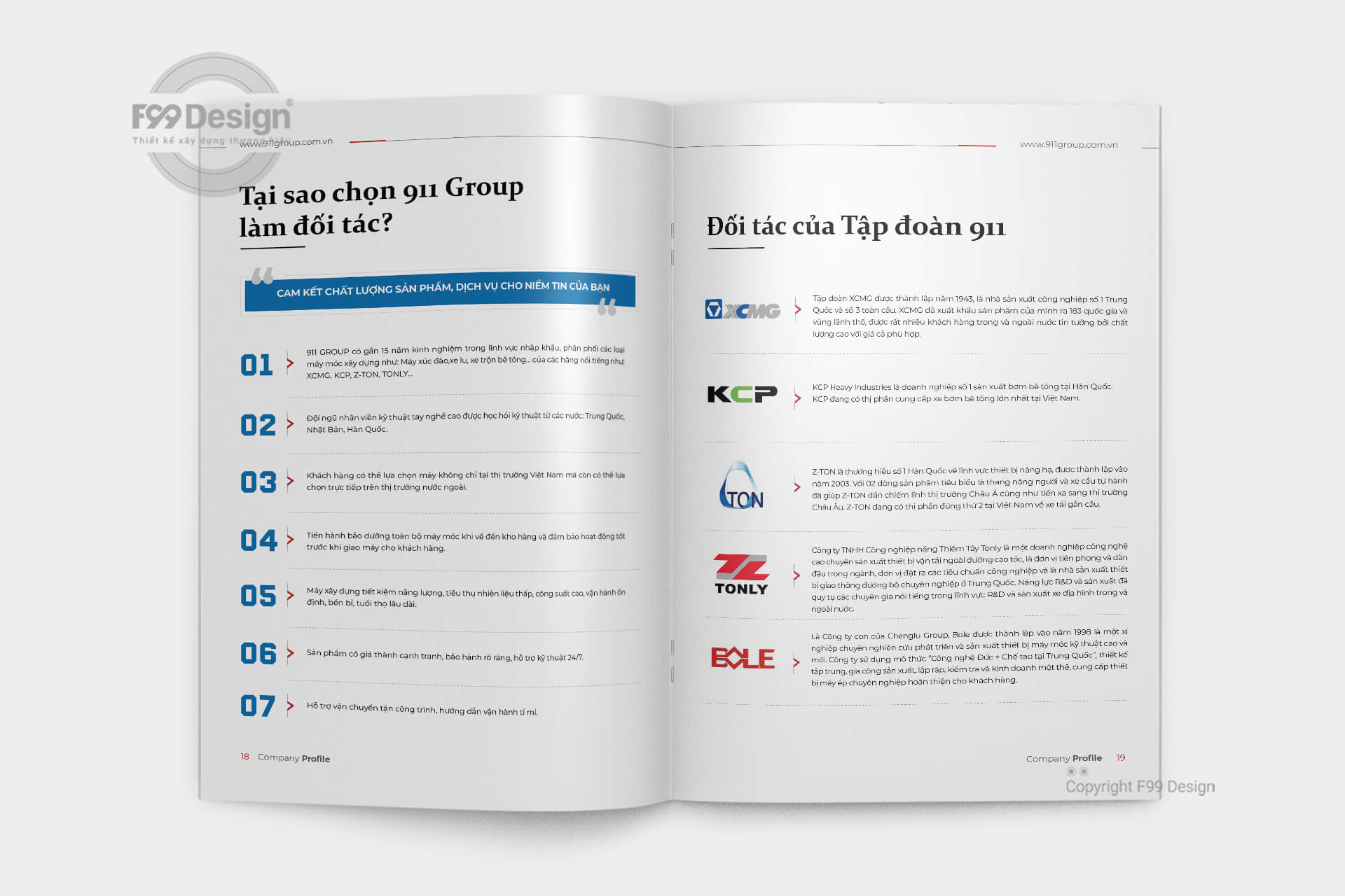 Với đội ngũ tư vấn thiết kế chuyên nghiệp nhiều năm kinh nghiệm về đấu thầu, dự thầu cho công ty, doanh nghiệp các công ty mới thành lập (công ty cổ phần, công ty TNHH…) dễ dàng gây ấn tượng thông qua cuốn Hồ sơ năng lực (Company Profile) một cách hiệu quả. Với kinh nghiệm hơn 6 năm hoạt động về xây dựng cuốn hồ sơ năng lực, khách hàng hoàn toàn yên tâm về chất lượng, giá rẻ, cũng như dịch vụ tại F99 Design. F99 Design cam kết mang tới khách hàng cuốn hồ sơ đầy đủ hồ sơ pháp lý, dịch vụ, mời thầu để gia tăng giá trị dự thầu cho nhà thầu một cách hiệu quả.
