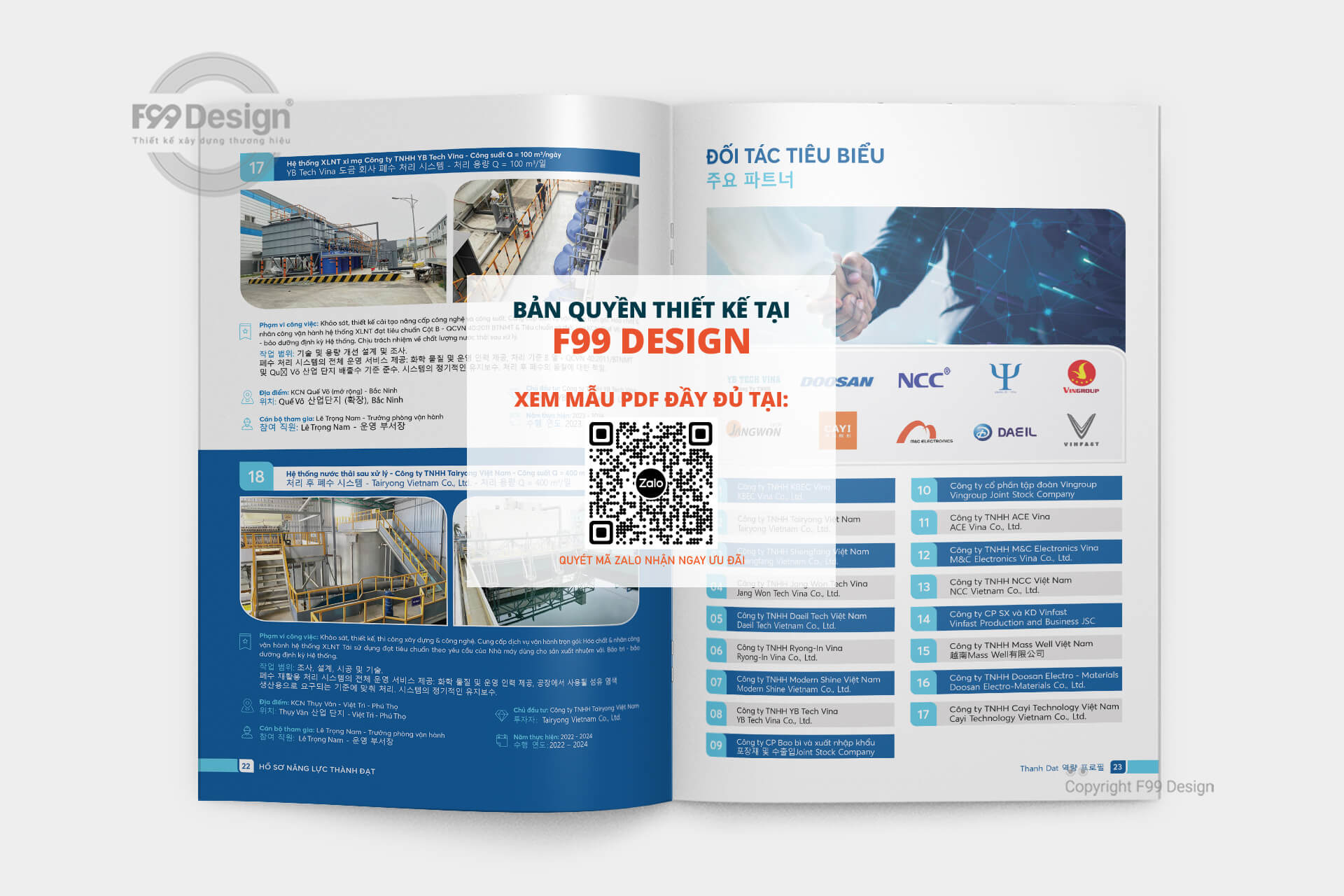 Với đội ngũ tư vấn thiết kế chuyên nghiệp nhiều năm kinh nghiệm về đấu thầu, dự thầu cho công ty, doanh nghiệp các công ty mới thành lập (công ty cổ phần, công ty TNHH…) dễ dàng gây ấn tượng thông qua cuốn Hồ sơ năng lực (Company Profile) một cách hiệu quả. Với kinh nghiệm hơn 6 năm hoạt động về xây dựng cuốn hồ sơ năng lực, khách hàng hoàn toàn yên tâm về chất lượng, giá rẻ, cũng như dịch vụ tại F99 Design. F99 Design cam kết mang tới khách hàng cuốn hồ sơ đầy đủ hồ sơ pháp lý, dịch vụ, mời thầu để gia tăng giá trị dự thầu cho nhà thầu một cách hiệu quả.